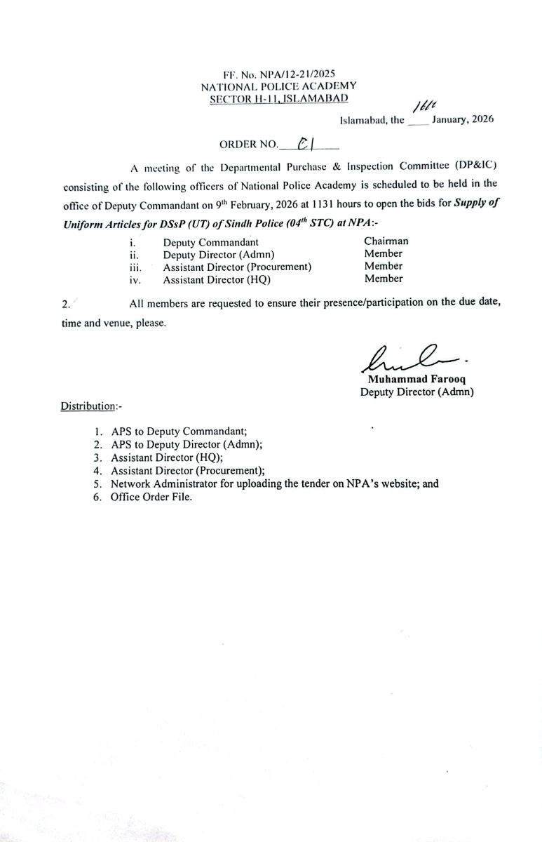 Supply of uniform articles for DSsP(UT) of Sindh Police(04 STC) at NPA